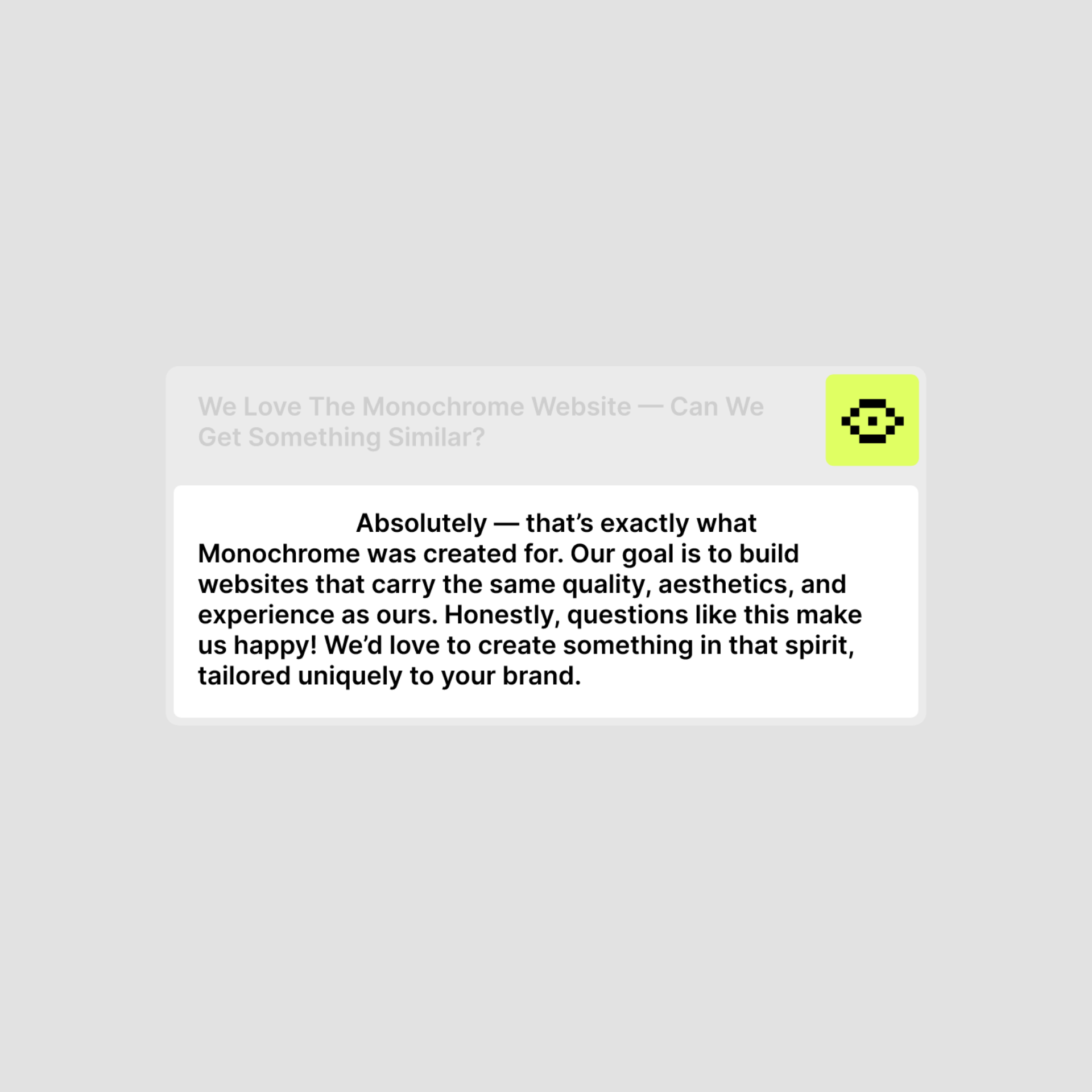 Absolutely â thatâs exactly what Monochrome was created for. Our goal is to build websites that carry the same quality, aesthetics, and experience as ours. Honestly, questions like this make us happy! Weâd love to create something in that spirit, tailored uniquely to your brand.